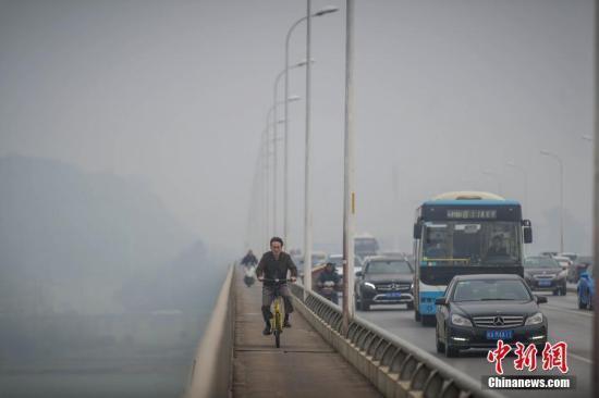2月17日,一位市民在雾霾中骑行。 胡超群 摄
