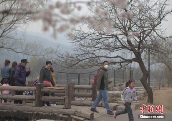 3月22日,北京遭遇雾霾天,空气质量达中度污染。图为市民在北京植物园赏春花。 中新社记者 刘关关 摄