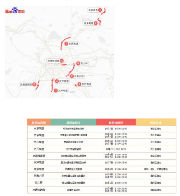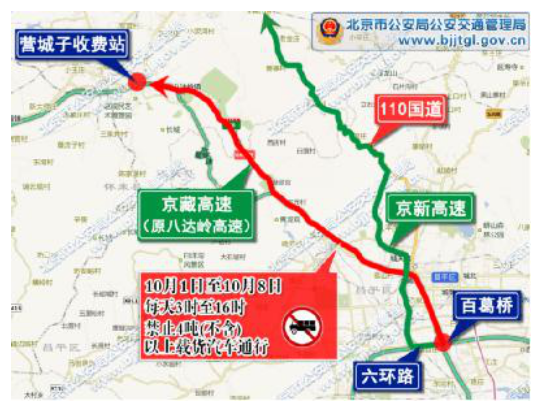 10月1日至10月8日,每天3时至16时,京藏高速公路百葛桥六环路出口至营城子收费站出京方向,禁止4吨(不含)以上载货汽车通行。机动车可绕行六环路、京新高速公路、110国道。