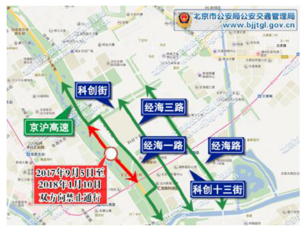 2017年9月5日至2018年1月10日期间,京沪高速(K7+800至K9+800段)双方向禁止通行,过往机动车可绕行封闭管理的北京经济技术开发区经海一路(科创街至科创十三街段)及新建导行路;原通行经海一路(科创街至科创十三街段)的行人及车辆,可绕行经海三路、经海路。