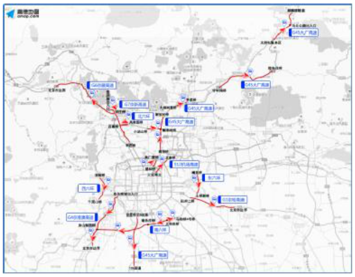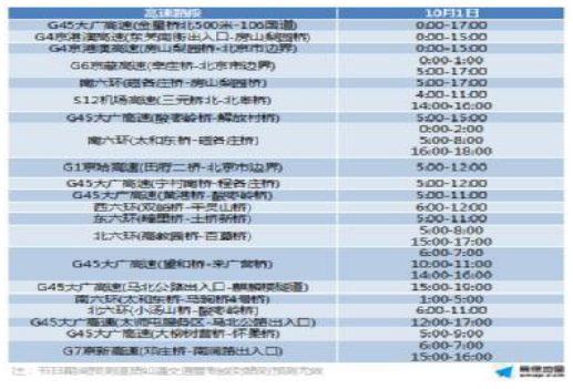 10月1日当天,京藏高速、京承高速、京哈高速、京港澳高速、大广高速出京方向车流集中,部分路段及收费站将出现拥堵情况。