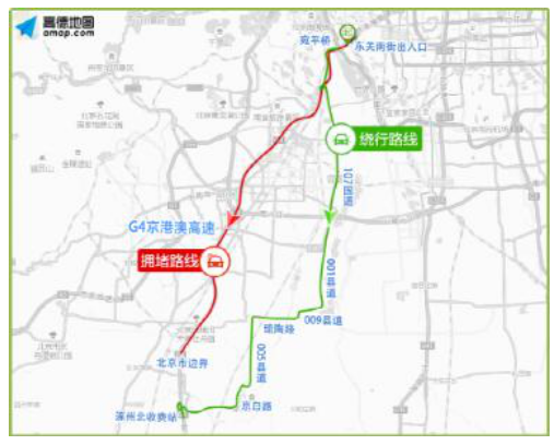 京港澳高速进京方向市界至梨园桥拥堵时,有如下两条绕路线可选: