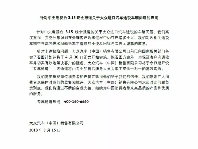 “3⋅15”晚会报道了关于大众进口汽车途锐的车辆问题,节目播出2个小时后,大众汽车在@大众进口汽车,作出声明。大众汽车表示,他们高度重视并充分意识到在处理客户诉求过程中仍存在诸多不足,同时对因相关途锐车辆空气滤芯进水问题,给车主造成的不便及困扰再次表示诚挚的歉意。针对上述缺陷问题,大众汽车日前已向国家相关部门备案了召回计划,并将于4月30日正式开始实施,并将于今日起开设一对一处理“专属通道”。