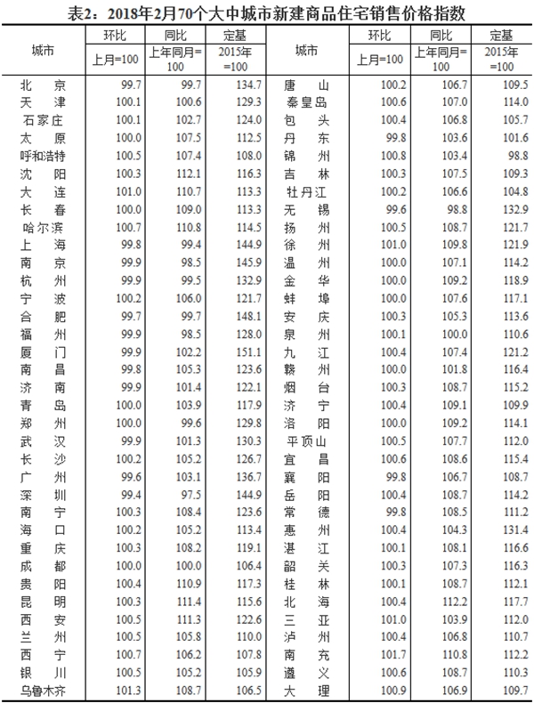 2018年2月70个大中城市新建商品住宅销售价格指数。图片来源:国家统计局官网