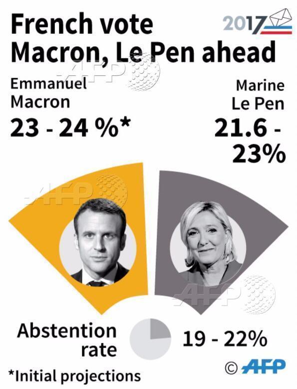 初步统计数据表明,马克龙获得23.7%的有效选票,勒庞获得21.7%的有效选票,右翼共和党候选人弗朗索瓦·菲永和极左翼组织“不屈法国”候选人让-吕克·梅朗雄均获得19.5%的有效选票。此外,左翼社会党候选人伯努瓦·阿蒙获得6.2%的有效选票。